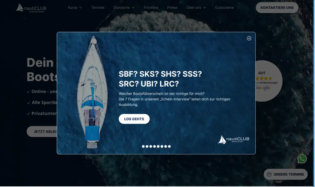 AUSGEZEICHNET Basierend auf 92 Bewertungen Gepostet auf X D.11 August 2025Trustindex überprüft, ob die Originalquelle der Bewertung Google ist. Absolute Empfehlung. Ich habe Probefahrt meinem Mann zum Geburtstag geschenkt- sehr gute Einweisung, Skipper hat mit Geduld und Leichtigkeit Grundlagen vermittelt. Die Fahrt hat uns großen Spaß bereitet (ich und unseren Sohn durften auch mitfahren). Mein Mann möchte unbedingt bei NautiClub Bootsführerschein machen. Vielen Dank!!!Gepostet auf R Wille7 August 2025Trustindex überprüft, ob die Originalquelle der Bewertung Google ist. Ich habe beim nautiCLUB D’dorf meinen SBF See und BINNEN gemacht und ich bin bei dem ganzen „Kurs“ sehr zufrieden gewesen Ob ich fragen zu den Kursen ,Prüfungen,Praxis Fahrten oder den organisatorischen Tätigkeiten hatte, wurden immer sehr schnell,freundlich,professionell,sachlich und fachlich beantwortet!!!! Ich hatte nie das Gefühl ,dass ich dem nautiCLUB Team zuviele oder blöde Fragen stellte und das von Mo. bis So. Da nochmals ein Dankeschön an Malte. Auch die Flexibilität des Teams bezüglich der Praxis Fahrten und die Abstimmung der Prüfungen ist auch noch mal hervorzuheben!!! ⭐️ ⭐️⭐️⭐️⭐️ Vielen Dank für die Zeit bei euch und macht weiter so!!!Gepostet auf A Coustenoble17 Juni 2025Trustindex überprüft, ob die Originalquelle der Bewertung Google ist. Der Kurs war ein Geburtstagsgeschenk für meine Frau und ich habe auch mitgemacht. Das Team ist sehr sympathisch und hilfsbereit. Was positiv aufgefallen ist, jederzeit war jemand ansprechbar um bei Problemen zu helfen. Wir haben mit dem Kombi Kurs SBF Binnen/See eine großartige Erfahrung und Grundlage zum bestehen der Prüfung gesammelt. Auch die Praxis war große Klasse. Insgesamt haben wir viel Spaß gehabt und können den NautiClub guten Gewissens weiterempfehlen. Darum : 5 Sterne 🌟 🌟🌟🌟🌟Gepostet auf L Kalka12 April 2025Trustindex überprüft, ob die Originalquelle der Bewertung Google ist. Top 👍 Bootschule!!Gepostet auf Moh22 Februar 2025Trustindex überprüft, ob die Originalquelle der Bewertung Google ist. Ich habe bei nautiClub meine Bootsscheine Binnen/ See gemacht und habe dank eurer tollen Vorbereitung alle Prüfungen bestanden. Deshalb möchte ich mich auf diesem Wege beim kompletten Team von nautiClub bedanken, Ihr macht echt einen super 👍🏻 Job ! ⛵️🚤🛟⚓️Gepostet auf A Niehaus24 November 2024Trustindex überprüft, ob die Originalquelle der Bewertung Google ist. Die Bootsschule hat mich super unterrichtet, so dass ich alle Prüfungen im 1. Versuch geschafft habe. Hat mir auch viel Spaß gemacht.Gepostet auf D Witte22 Juni 2024Trustindex überprüft, ob die Originalquelle der Bewertung Google ist. Top organisiert, nettes Team, Kurse haben viel Spass gemacht. Die trockene Materie gut und locker rübergebrachtGepostet auf P Rhein12 Mai 2024Trustindex überprüft, ob die Originalquelle der Bewertung Google ist. SKS-Törn Mai 2024, Lemmer! Herzlichen Dank für die vielen neuen und intensiven Erfahrungen auf dem SKS-Törn! Klasse Skipper, nette Teilnehmer, sehr viel Training und zum Schluss eine bestandene Prüfung! Ich kann nautiCLUB nur empfehlen! Viele Grüße Gilbert